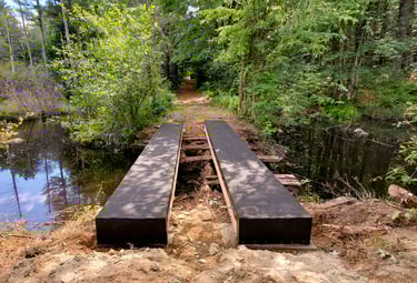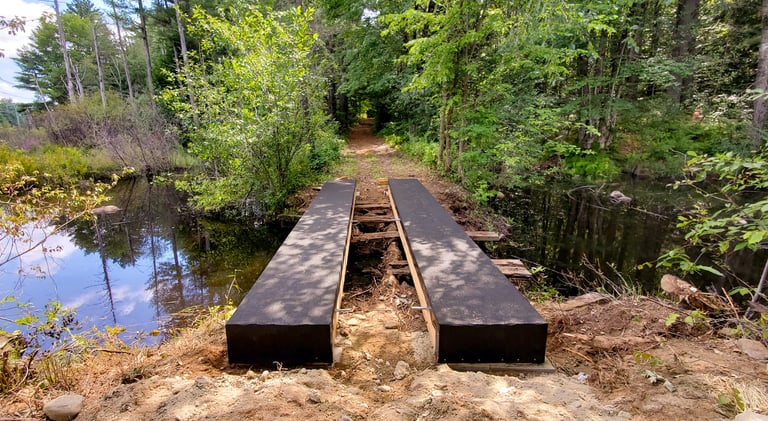 A key challenge was designing a bridge that was structurally sound yet practical to build and transport. It was important that material selection ensured longevity against exposure to the elements. The final design used two sets of three grouped 8"x12" hemlock beams as the primary supports. These were chosen for their high strength and resistance to wet/dry cycles. Cross treads were then installed over the beams to complete the deck. For the footings, concrete blocks were placed at the river’s edge, backfilled with soil, and capped with pressure-treated lumber to support the beams.
